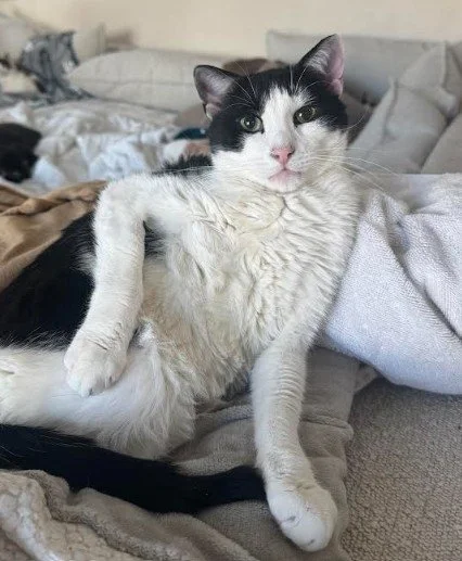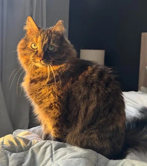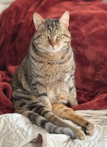 Frosty is Brandy’s brother and is a special-needs cat. Unlike Brandy, Frosty was diagnosed with both progressive retinal atrophy, which severely affects his vision, and congenital diffuse myopathy, a rare muscle disorder with limited scientific research. His condition makes him extra cautious, prevents him from jumping or climbing without assistance, and leaves him easily exhausted after play, which presents as heavy breathing and muscle tremors in his body and face. Because so little is known about his condition, it’s impossible to predict how he’ll progress over time. We are hopeful he will live a long and happy life, but at minimum, he will likely need many accommodations as he ages. For his safety, stability, and quality of life, Frosty remains with us permanently so that his needs can be carefully monitored and managed, and so he stays comfortable getting around in a familiar place. Despite these challenges, Frosty enjoys life to the fullest: hunting (loudly) with his pom-pom toys, lounging in the catio, snuggling with his humans, and being carefully monitored by his bestie/seeing-eye-cat, Brock.